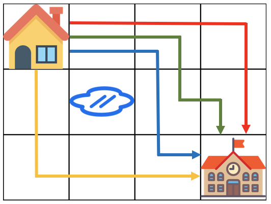 ๊ณ์๋๋ ํญ์ฐ๋ก ์ผ๋ถ ์ง์ญ์ด ๋ฌผ์ ์ ๊ฒผ์ต๋๋ค. ๋ฌผ์ ์ ๊ธฐ์ง ์์ ์ง์ญ์ ํตํด ํ๊ต๋ฅผ ๊ฐ๋ ค๊ณ ํฉ๋๋ค. ์ง์์ ํ๊ต๊น์ง ๊ฐ๋ ๊ธธ์ m x n ํฌ๊ธฐ์ ๊ฒฉ์๋ชจ์์ผ๋ก ๋ํ๋ผ ์ ์์ต๋๋ค. ์๋ ๊ทธ๋ฆผ์ m =