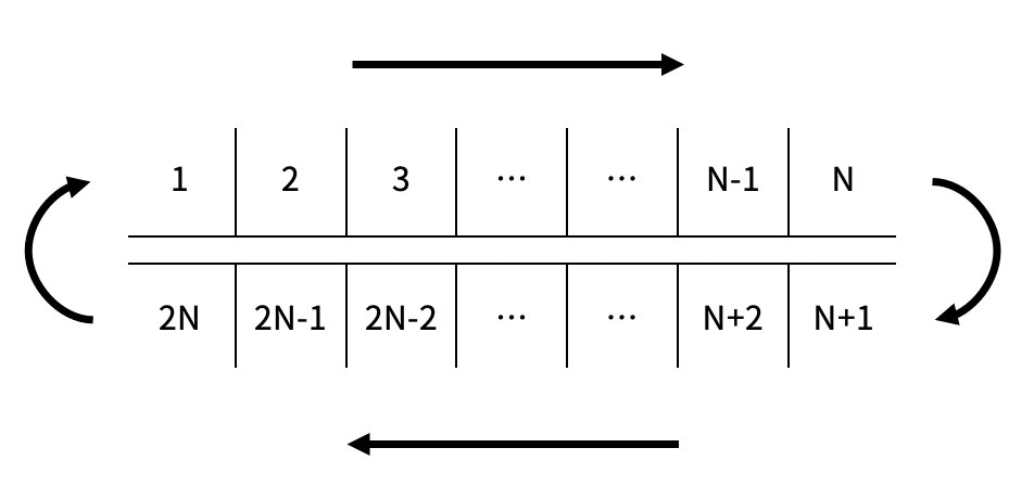๊ธธ์ด๊ฐ N์ธ ์ปจ๋ฒ ์ด์ด ๋ฒจํธ๊ฐ ์๊ณ , ๊ธธ์ด๊ฐ 2N์ธ ๋ฒจํธ๊ฐ ์ด ์ปจ๋ฒ ์ด์ด ๋ฒจํธ๋ฅผ ์์๋๋ก ๊ฐ์ธ๋ฉฐ ๋๊ณ ์๋ค. ๋ฒจํธ๋ ๊ธธ์ด 1 ๊ฐ๊ฒฉ์ผ๋ก 2N๊ฐ์ ์นธ์ผ๋ก ๋๋์ด์ ธ ์์ผ๋ฉฐ, ๊ฐ ์นธ์๋ ์๋ ๊ทธ๋ฆผ๊ณผ ๊ฐ์ด 1๋ถํฐ 2N๊น์ง์ ๋ฒํธ๊ฐ ๋งค๊ฒจ์ ธ ์๋ค.