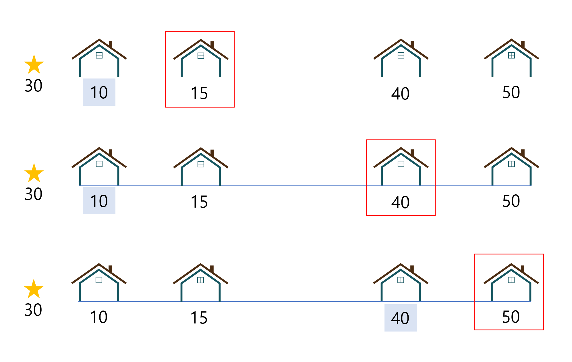 โป๏ธ ์ธ ๋ฒ์งธ ์ง์ธ 40์ ๊ฒฝ์ฐ ์ด์ ์ง 10๊ณผ์ ๊ฑฐ๋ฆฌ์ฐจ๊ฐ 30์ด๋ฏ๋ก ๊ธฐ์ค์ ๋ง์กฑํ์ฌ ๊ณต์ ๊ธฐ๋ฅผ ์ค์นํ ์ ์๋ค. ์ด๋ ๊ธฐ์ค์์น๋ ์๋ก ๊ณต์ ๊ธฐ๋ฅผ ์ค์นํ ์์น์ธ 40์ผ๋ก ์ฎ๊ฒจ๊ฐ๋ค.